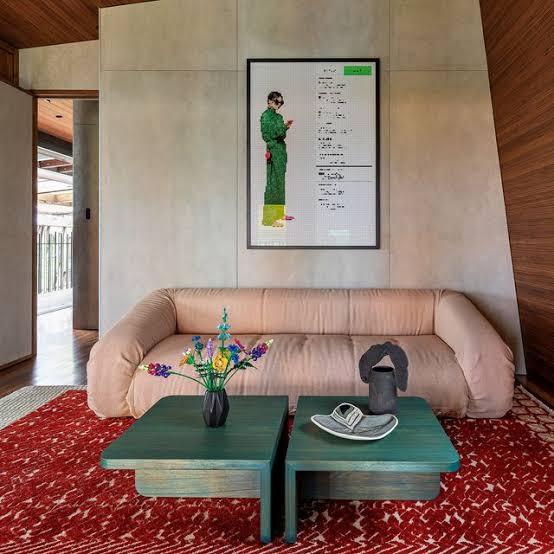 2. Muebles y textiles: sofás, sillas o cortinas en azul petróleo o verde musgo crean un contraste natural con los tonos neutros del piso y paredes.
